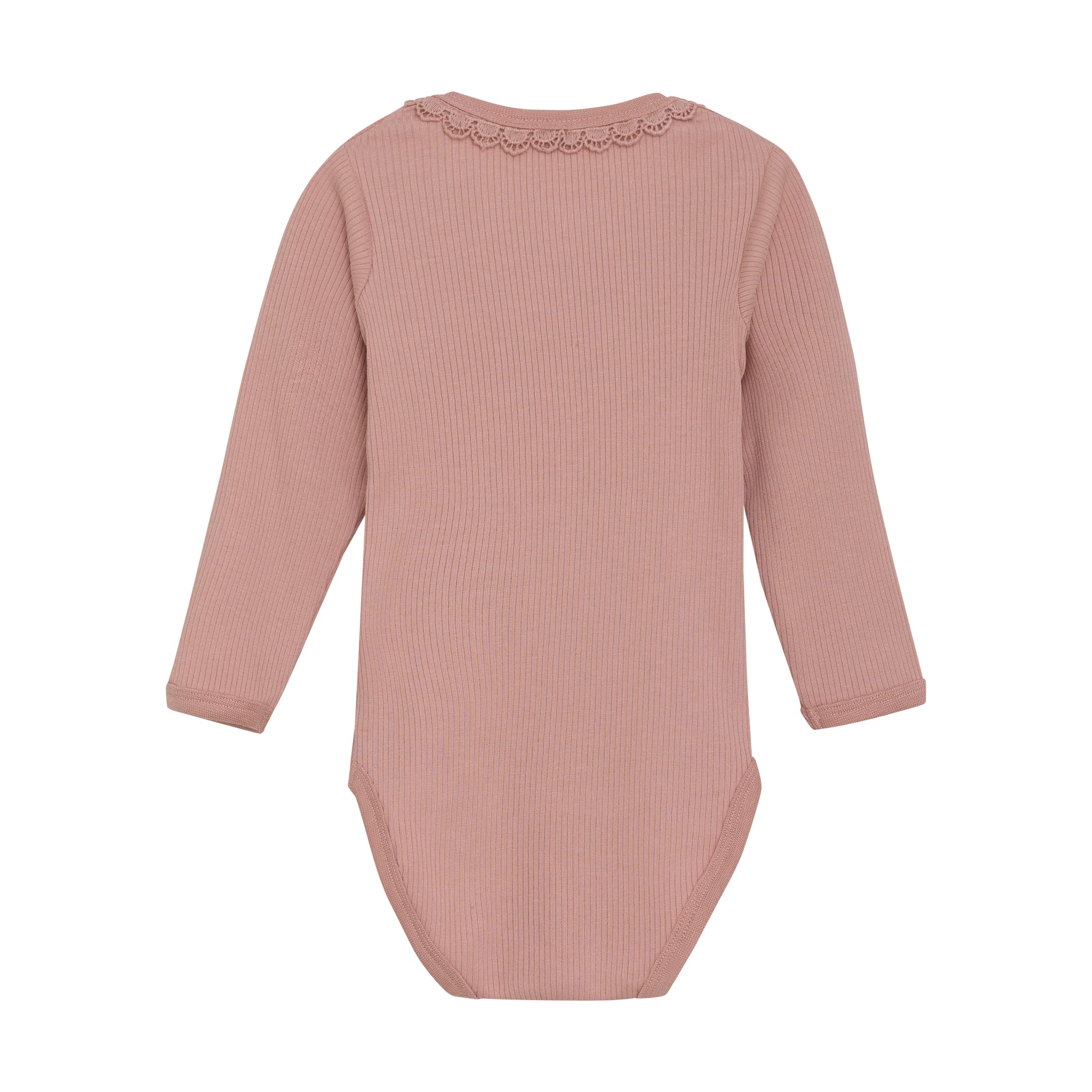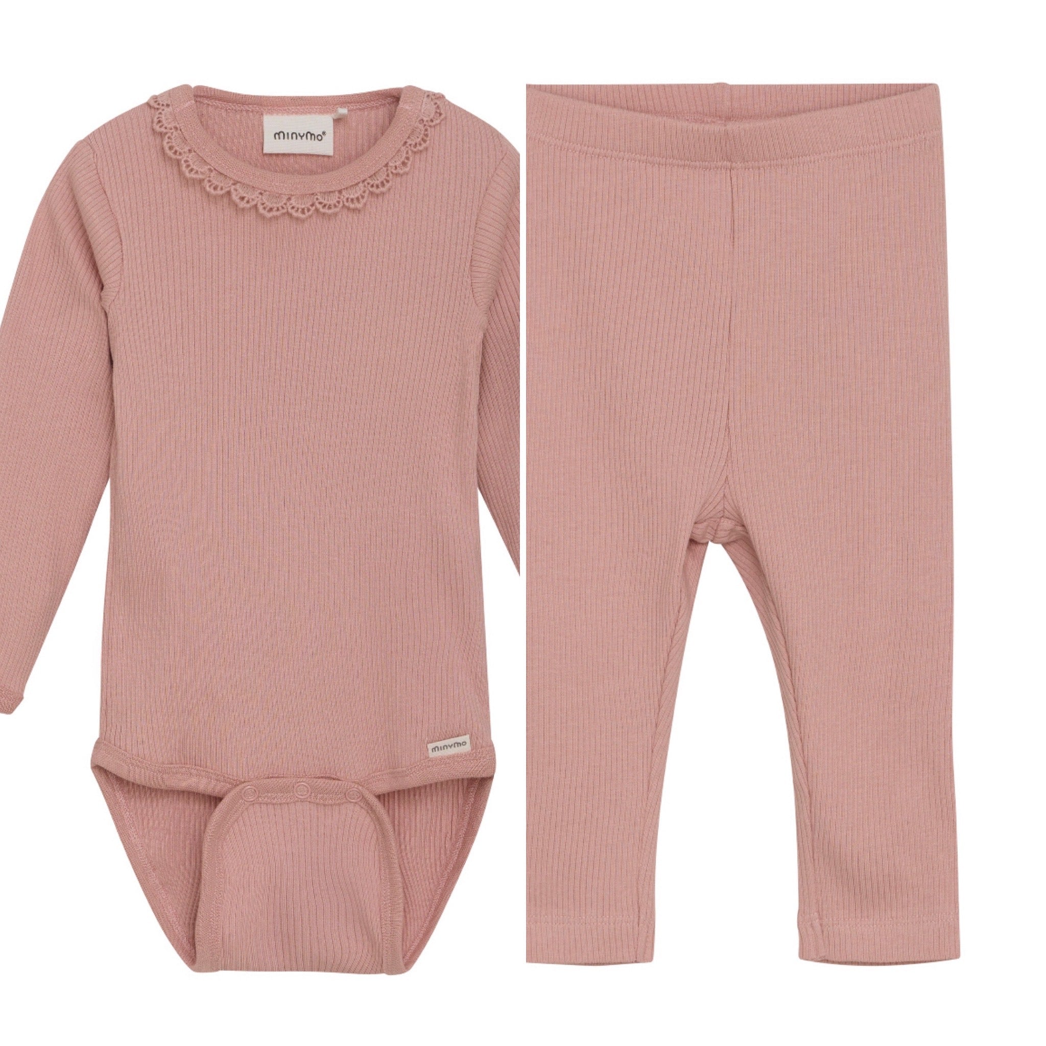 Keep it cozy and cute with the Minymo Rib Onesie and Legging in Orchid. This playful set features a soft ribbed texture perfect for everyday adventures, while delicate lace details on the onesie add a touch of charm. The matching leggings complete the look, making dressing your little one both easy and adorable. 114052 114092