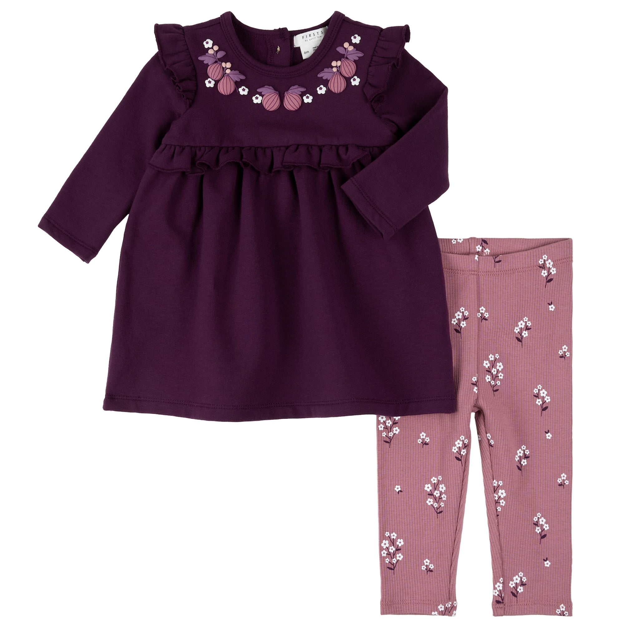 This autumnal set features a long-sleeved dress and coordinating floral leggings. The dress has delicate ruffle details and is finished with a button placket at the back for easy dressing. For chilly days, the ribbed leggings layer underneath for a sweet and comfy fit. 25FGW37E01B