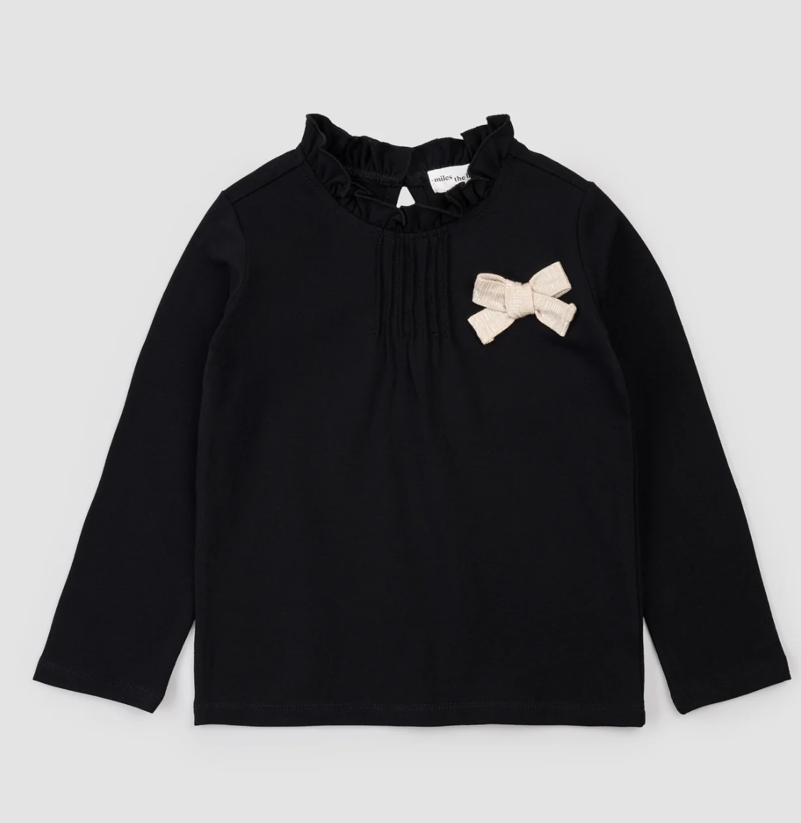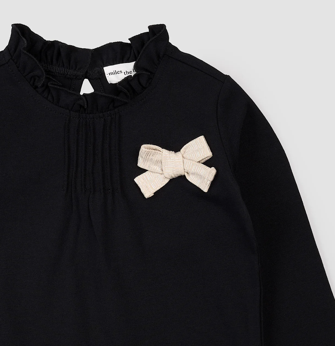A refined wardrobe staple that adds a little elegance into their everyday outfits, this black top features a ruffled neckline and a grosgrain bow on the front. Made from organically grown cotton jersey, the top is light and flexible, allowing her to live her day to the fullest while still looking sophisticated.