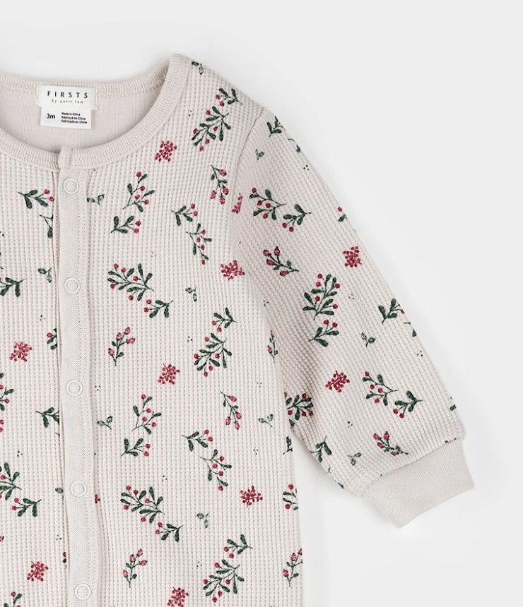 This cozy thermal sleeper features our festive Winterberry Holly print and there’s matching PJs available for older siblings. The sleeper has integrated feet to keep tiny toes warm and ribbed cuffs for curious hands. Finished with snap button fastenings down the front and along both legs, the sleeper is easy to put on and take off wriggly little ones.