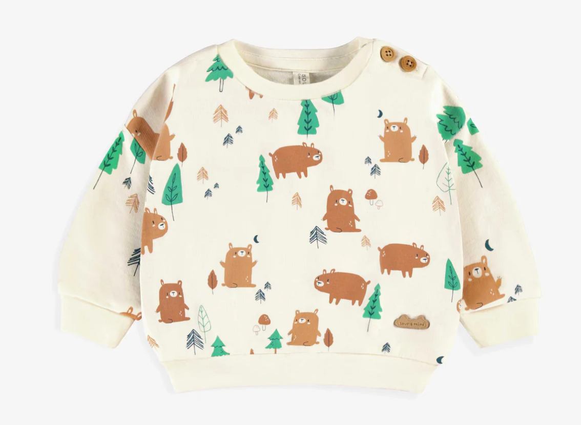This cream outfit features delightful forest-inspired prints and cozy ribbed cuffs and hem for a perfect fit. Two convenient shoulder buttons make dressing quick and easy. The coordinating grow pant includes a stretchy ribbed waistband that adjusts as your baby grows. Crafted from soft, stretchy French terry, this set ensures your little explorer stays comfy and ready for fun. L3107L L3105L