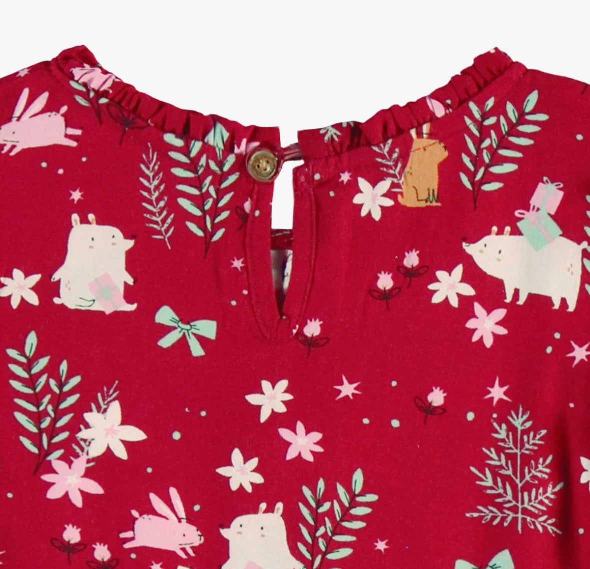 This red dress features festive patterns and charming details, such as elasticized cuffs that create a delicate ruffle and additional ruffles on the upper sleeves for an adorable look. Made from lightweight, flowy viscose, it ensures comfort and elegance. C8005C