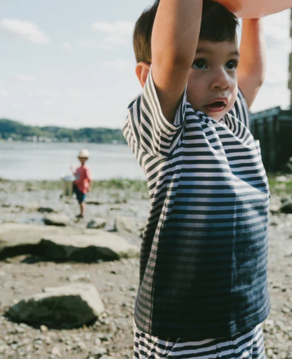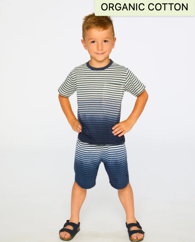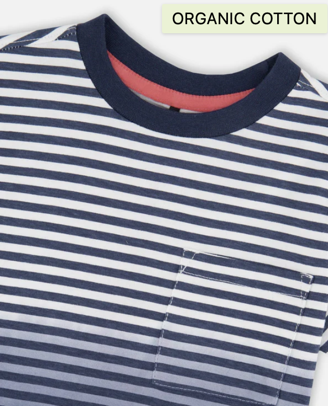 Brighten your wardrobe with this cheerful organic cotton tee featuring a stunning blue gradient stripe design. A practical chest patch pocket adds functional charm, while the classic round neckline and short sleeves keep things comfortable and casual. Made from soft, sustainable organic cotton, this tee is as kind to the planet as it is to your skin. H30T73