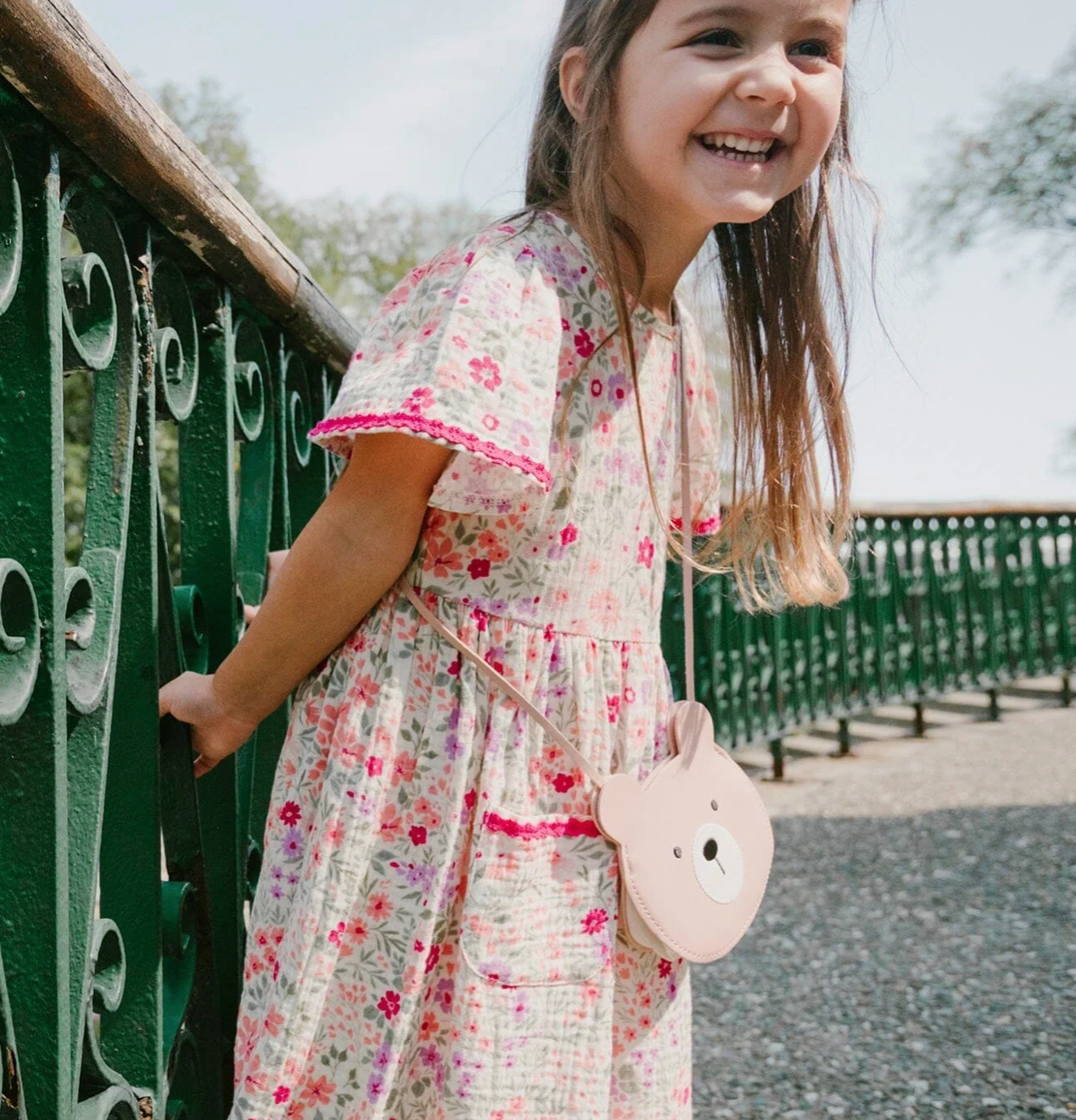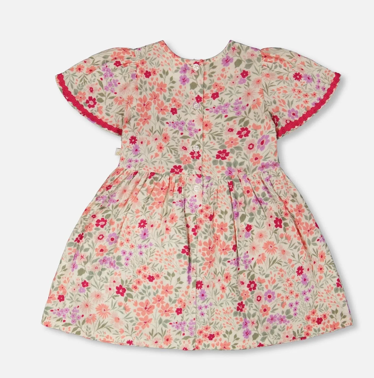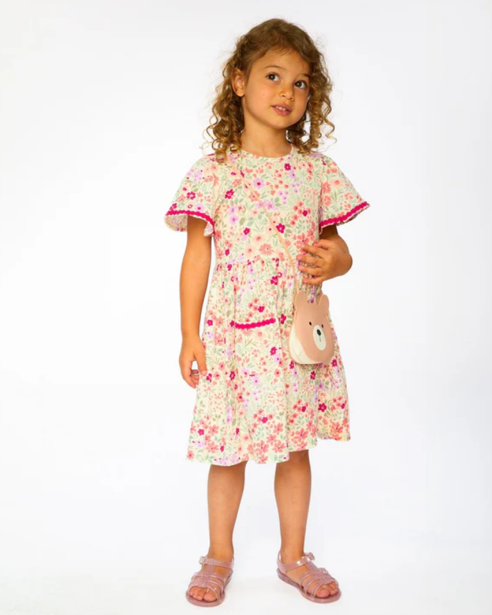 Twirl into summer style with this delightful off-white muslin dress adorned with charming printed flowers. Designed for young girls who love to move and play, it features flutter sleeves that dance with every motion, a gathered waist for a flattering fit, and a flared skirt perfect for spinning. Practical front patch pockets add a fun touch, while the soft cotton muslin fabric keeps her cool and comfortable on warm days. A whimsical wardrobe essential that's as playful as she is. H30F87