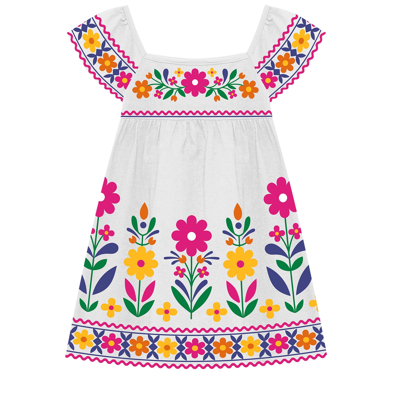 Twirl into springtime style with this charming cotton jersey Nanai dress! Delicate flowers bloom upward from the hem in a whimsical print that dances across a crisp white bodice. Playful ric rac trim adds a vintage-inspired touch that's equal parts sweet and spirited. Perfect for garden parties, casual outings, or whenever you want to add a pop of botanical charm to your day. A dress that celebrates the joy of getting dressed. 6000323
