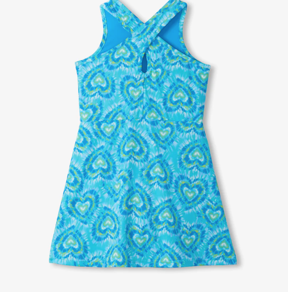 Bring bold energy to her closet with this active dress! This sporty A-line dress features an all-over heart print in vibrant shades of turquoise, aqua, and lime against a blue tie-dye background. Crafted from a stretchy performance blend with built-in shorts, it’s designed for all-day comfort and confident coverage. A rounded front neckline and defined waist create a flattering fit, while criss-cross back straps and a small keyhole opening add stylish, breathable detail. Perfect for play, practice, and everything in between! S26CBK1889
