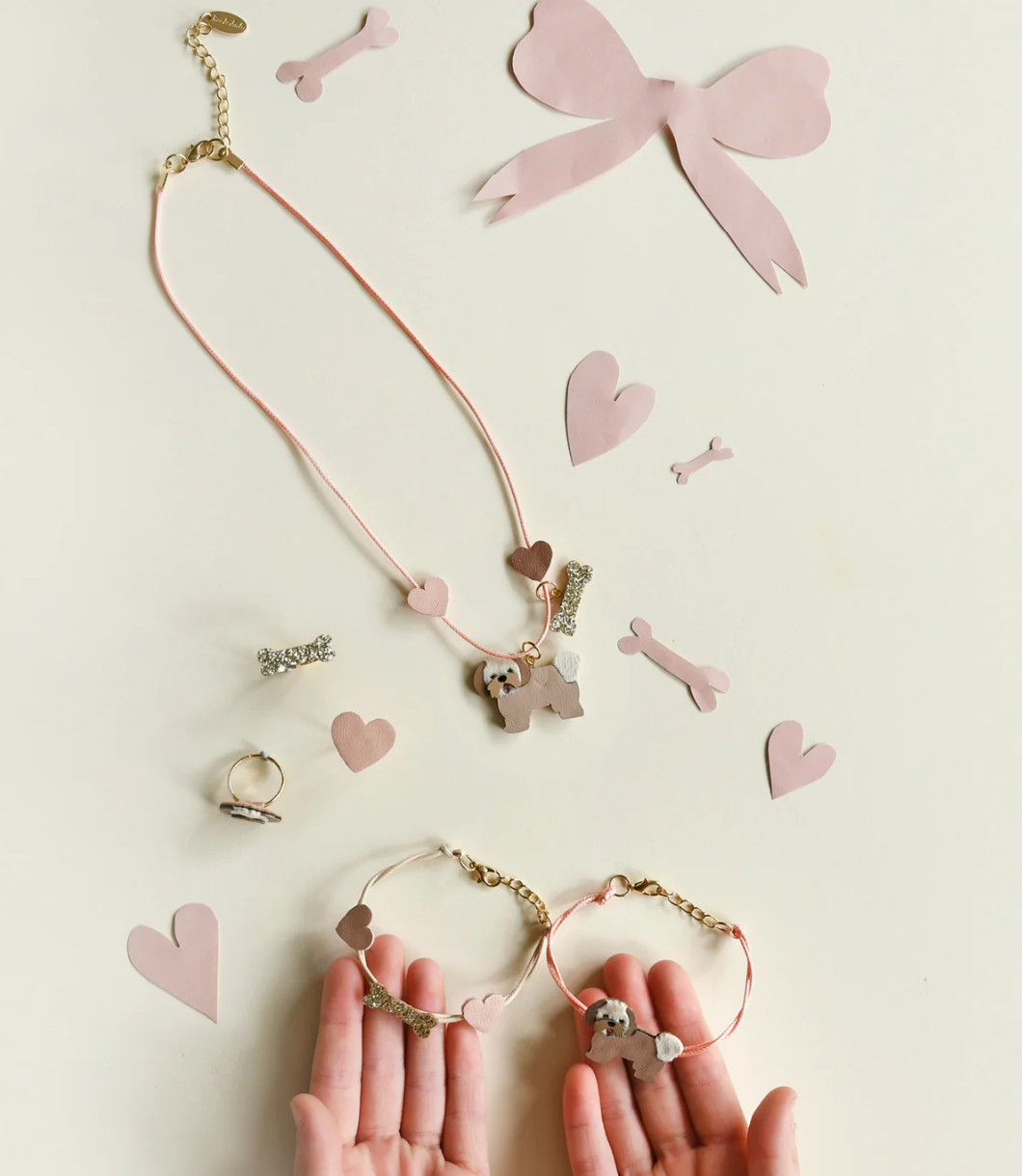 Our darling Dolly Dog bracelet set will set little tails wagging! This set of two bracelets feature our sweet little Shih-Tzu puppy, a glittery gold bone and pink PU hearts set on a pretty pastel coloured cords with a lobster clasp fastening and extender chain to ensure the perfect fit. Y243B