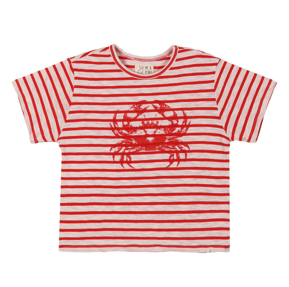 The Me and Henry Newquay Tee features a yarn-dyed red and cream stripe design, ensuring color retention and durability. The incorporation of a red crab image adds a unique visual element, appealing to maritime themes. This garment combines style with practicality, suitable for casual wear while maintaining high-quality fabric standards.