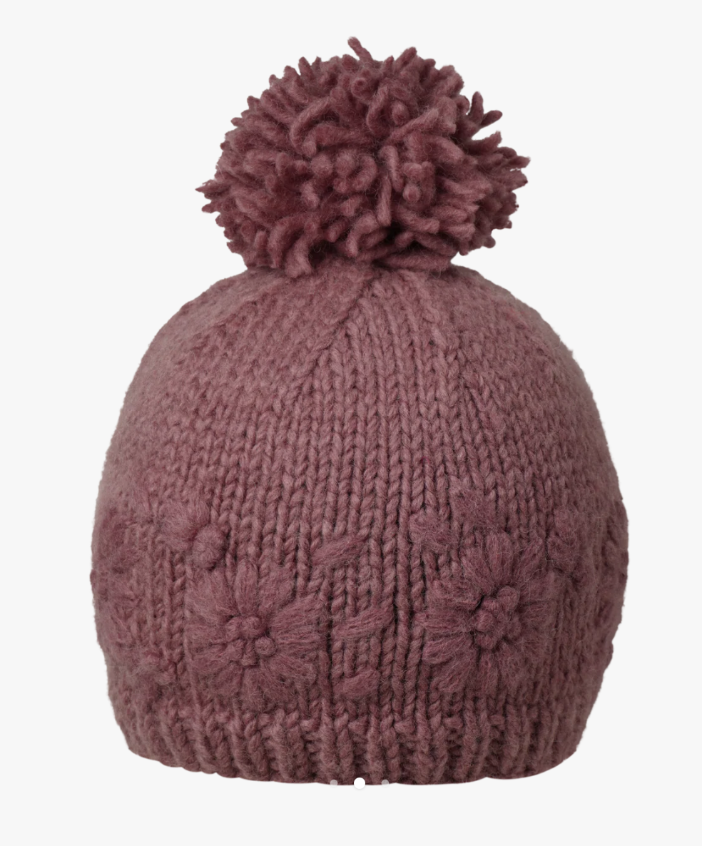 Stay warm in understated elegance with this wool pom beanie, thoughtfully lined with soft fleece for enhanced comfort. Delicate embroidered flowers adorn the crown, adding a refined botanical touch to your winter wardrobe. The plush pom completes the look with effortless charm. Perfect for those who appreciate quality craftsmanship and subtle artistry in their cold-weather essentials. 1077