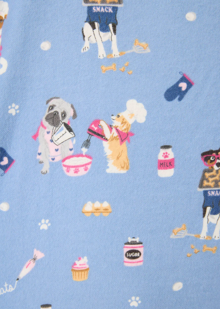 Sleep, lounge, repeat in this dream of a three-piece flannel set. Made from soft cotton in a classic twill weave, it includes a button-up shirt, relaxed-fit pants, and a matching headband to top things off. The soft blue fabric is sprinkled with pups baking cupcakes, plus playful paw prints and kitchen doodles—bringing a lighthearted touch to your bedtime lineup.