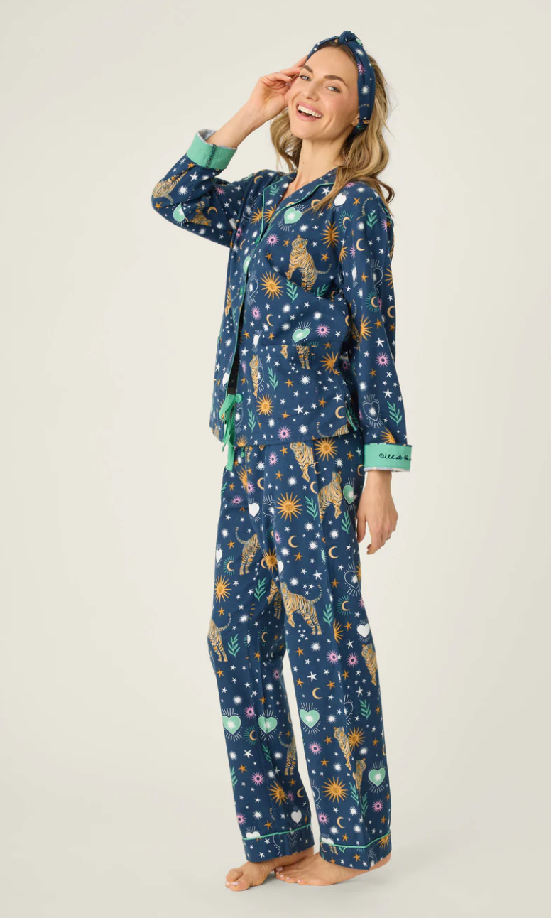 Our iconic flannel PJ set is made of the softest 100% cotton flannel. It's a favorite for all the good reasons: easy fit, comfy shape, and all your favorite prints. This three-piece set features a classic button-up notch collar double pocket top and classic straight leg pants and eye mask.