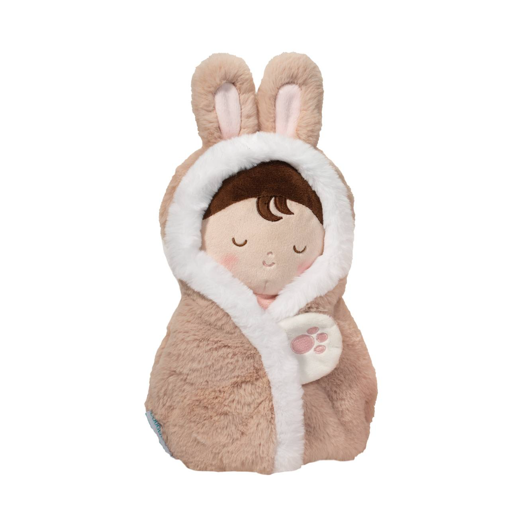 Treat your little one to a cuddle bunny like no other with our Baby Bunny Hug! Brimming with whimsy and charm, this interactive soft toy will capture the imagination and inspire hours of play. Wrap the Baby doll within the cozy swaddle when it's time to nap. The closure is designed for easy use and has been detailed with a pink, embroidered paw print. A pair of rabbit ears accent the swaddle’s plush trimmed hood, while a fluffy, white tail accents the back. With its variety of soothing textures and baby safe embroidered features, this soft toy is as suited to nap time as it is to play time. Bring home our Baby Bunny Hug for the very best in woodsy snuggles! 6058