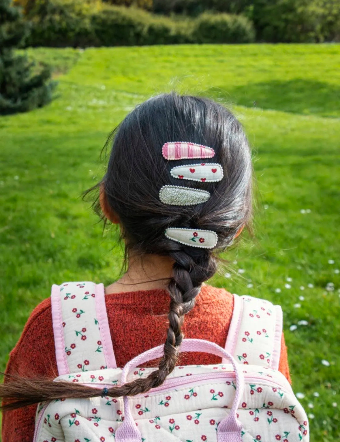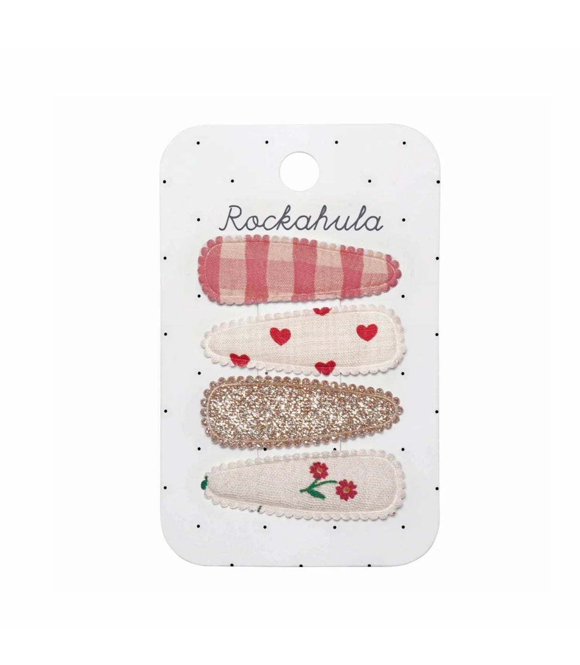 Mix and match this lovely pack of four clips, featuring our Taylor gingham, glittery gold fabric, our wildflower fabric and our sweet love heart fabric. Wear them one at a time or all at once.