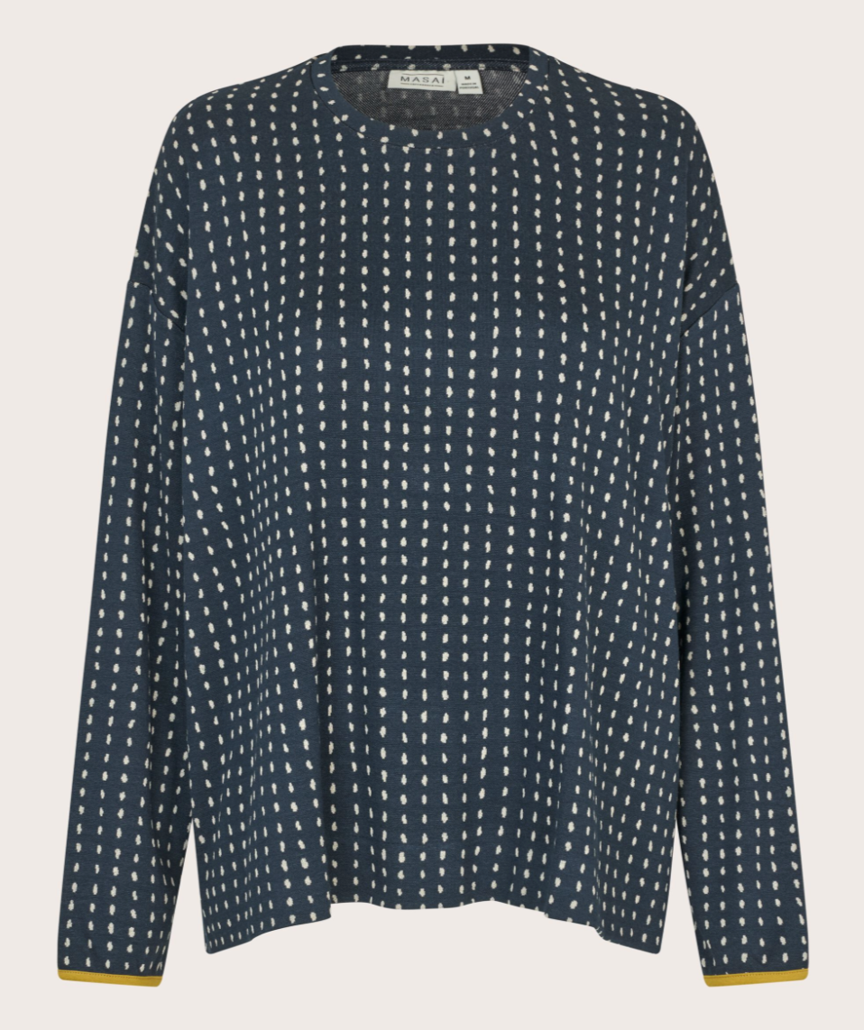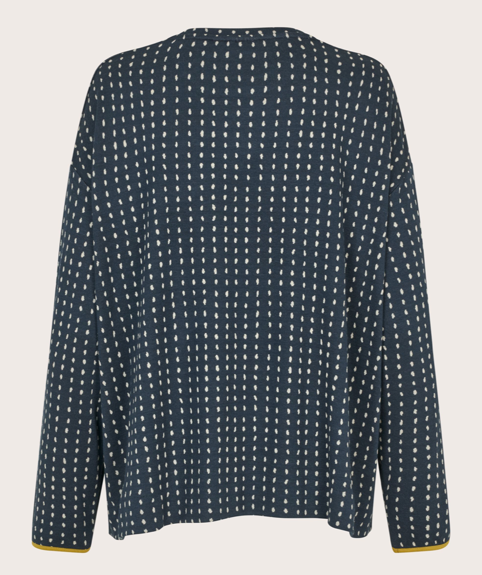 You can never have too many beautiful tops. This polka dot top is crafted from soft jersey material that is so comfortable, you'll want to wear it all day. With its oversize cut, the top drapes loosely over your body, while the long narrow sleeves provide a stunning contrast. Don't miss the charming detail with the narrow deep yellow edging, which perfectly complements the dark blue. The top also features a round neckline, dropped shoulder seams, and short slits at the sides. Wear it with slim trousers or skirts for an effortlessly stylish look. 1010759 Indigo