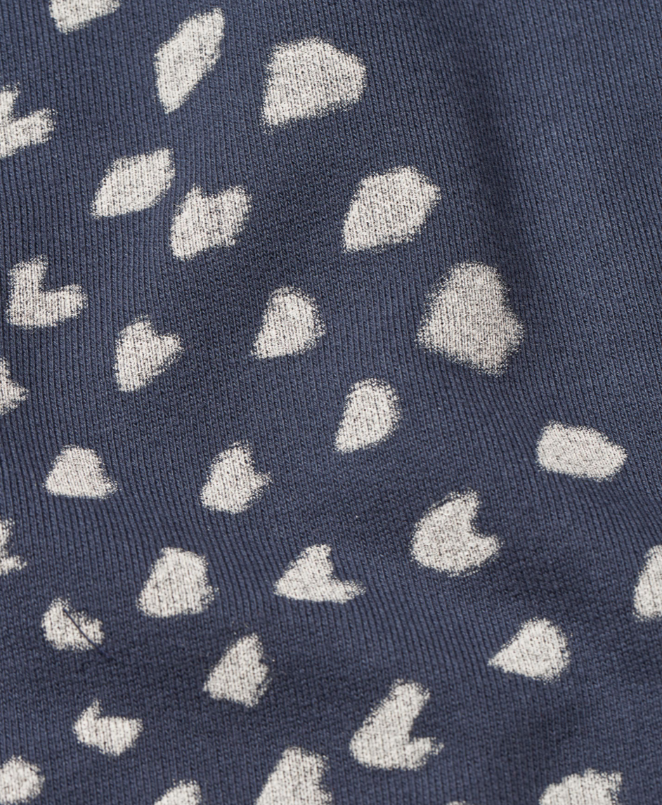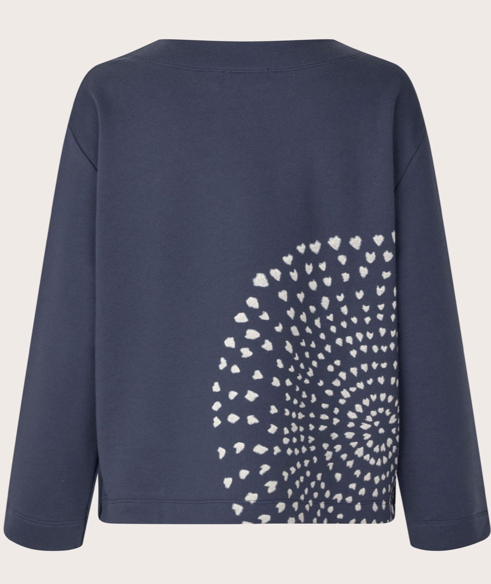 The beautiful hand-painted print makes all the difference for this top. It's delicate, feminine, and extremely comfortable. The french terry sweatshirt fabric gives the top an extra softness, and with its classic cut, it falls nicely and straight. It features a round neck, long sleeves, a zipper feature on both sides on an otherwise very simple design. A soft season favourite! 1010787 Indigo