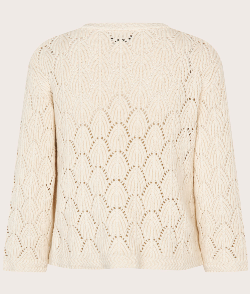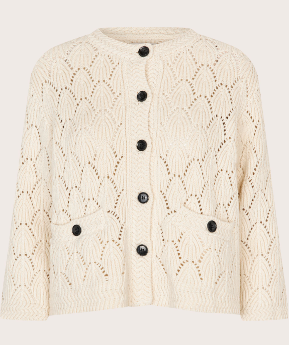 This feminine cardigan in soft cotton blend fabric features a beautiful openwork pattern that adds lightness and elegance. The black buttons create a stylish contrast, while three-quarter length sleeves and front pockets emphasise the relaxed look. Wear it over a shirt with suit trousers or with jeans for a simple and sophisticated look. 1011122