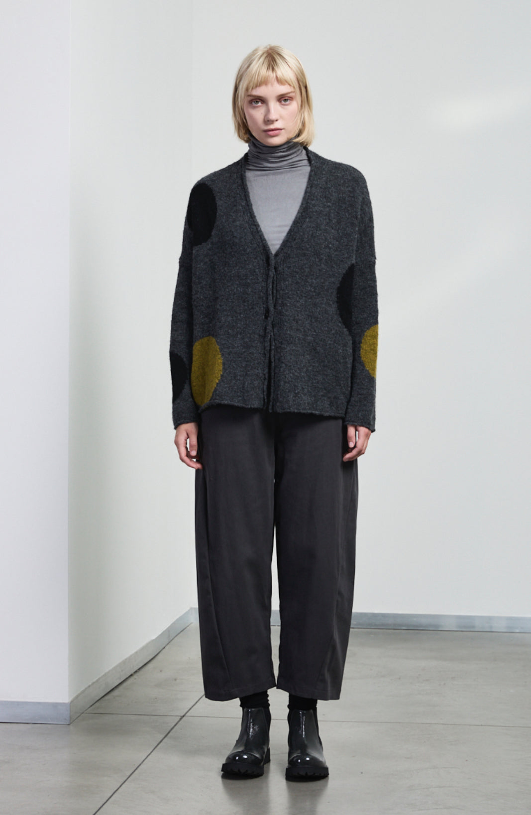 The Neirami Dot Cardigan in Anthracite features a loose, flowing silhouette defined by wide, abundant lines that enhance comfort and movement. Its thoughtfully designed cut offers a dynamic yet relaxed fit, making it an elegant and versatile layering piece for a sophisticated wardrobe. K114-TP
