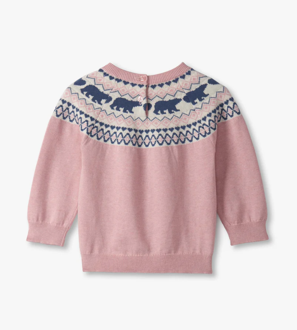 The Baby Girls Bear Pull On Sweater Set in Pink is a cozy and adorable outfit designed for comfort and style. The light pink sweater features a charming blue and white pattern across the chest and shoulders, with playful hearts and bears nestled within it. The long-sleeve top has elastic cuffed wrists, ankles, and hem for a snug fit, while the elastic waistband with faux drawcord on the matching pants adds extra comfort. A two-button placket on the back of the neck ensures easy dressing. F25PPI1576