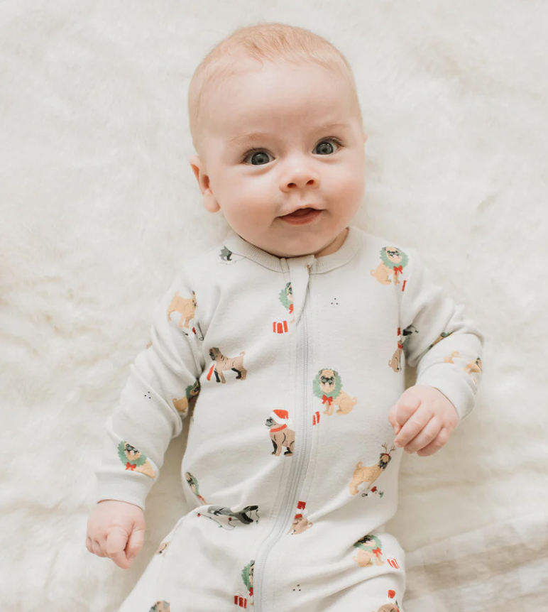 What better way to fall asleep than snuggled up with festive pugs. Made from soft, organically grown cotton rib, this cozy sleeper has integrated feet and ribbed cuffs to keep them warm and comfortable while they sleep or play. The two-way zipper makes for easy changes, and matching sibling PJs mean the kids can cuddle up with their real furry friend in perfect coordination.