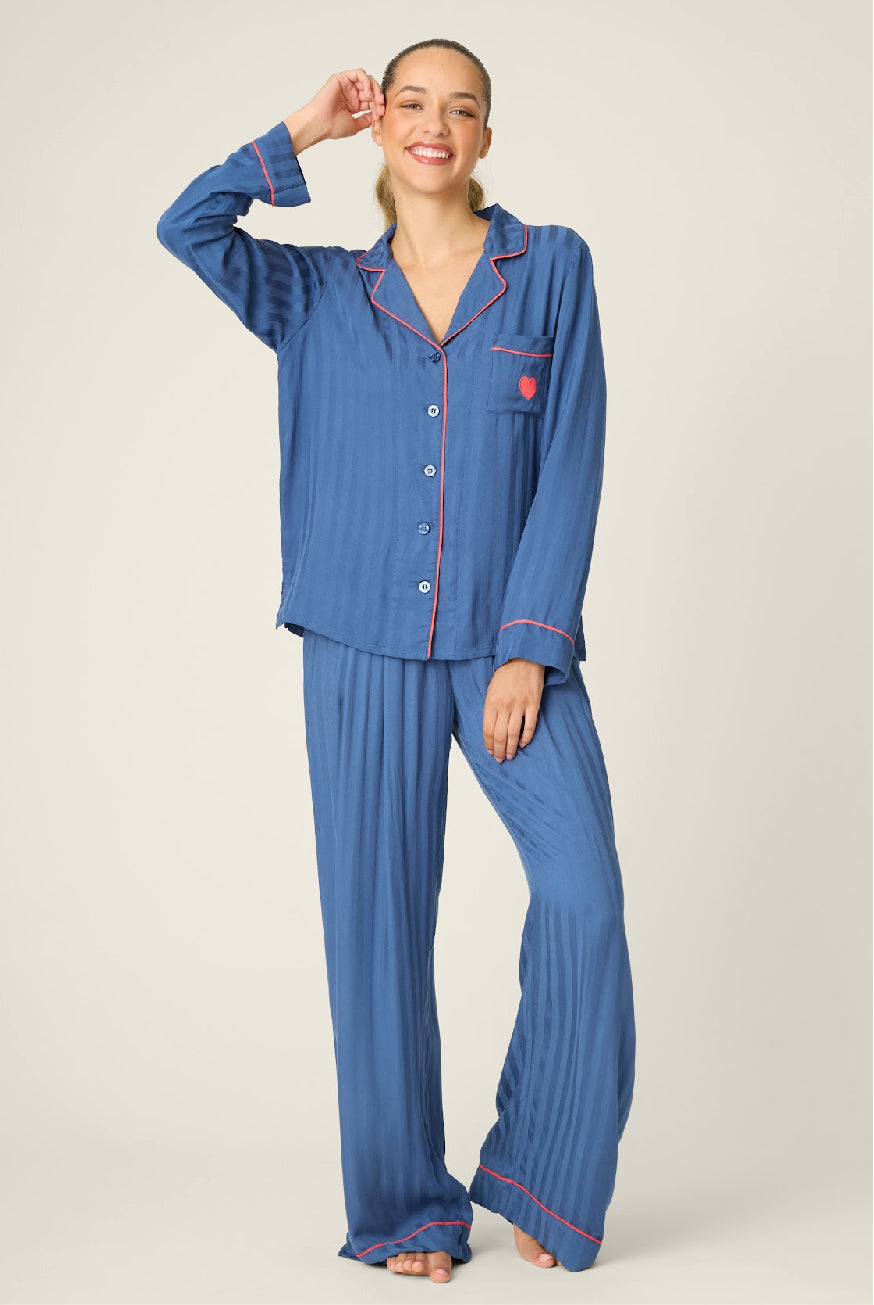 Women’s pajama pant set in jacquard sateen with tonal stripes, contrast piping, and heart-embroidered pocket.